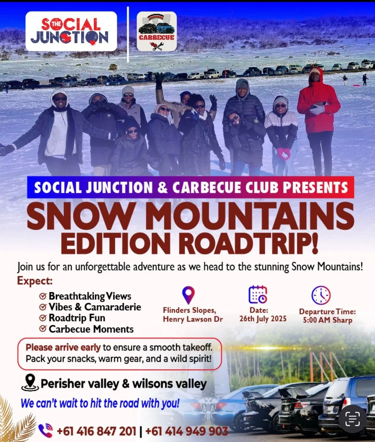 Pack your warmest gear — the Social Junction x Carbecue Club Snow Mountains Edition is here! On 26th July 2025, we hit the road to Perisher and Wilsons Valley for breathtaking views, BBQ moments, and a day packed with roadtrip fun and camaraderie. Limited spots — don’t get left behind!