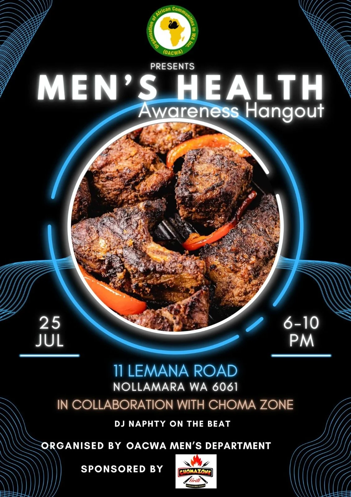 Join us on July 25 for a sizzling evening of grilled meat, powerful conversations, and brotherhood at the Men’s Health Awareness Hangout in Nollamara, WA. Hosted by OACWA in collaboration with Choma Zone, this free event is all about connection, culture, and supporting African-Australian men. Let’s talk, eat, and grow together.
