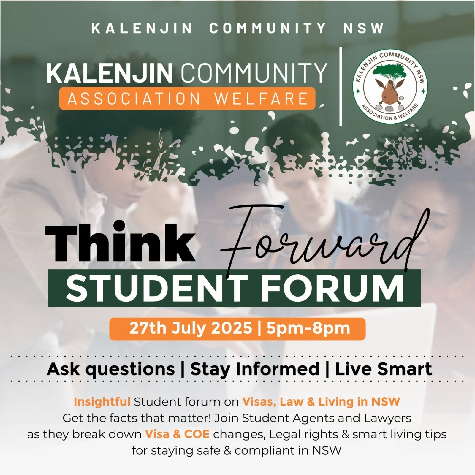 Don’t miss the Think Forward Student Forum hosted by the Kalenjin Community NSW on 27 July 2025. This one-stop event delivers vital info on visas, law, and smart living in Australia. Connect with student agents, legal experts, and fellow students to get your questions answered and stay informed.