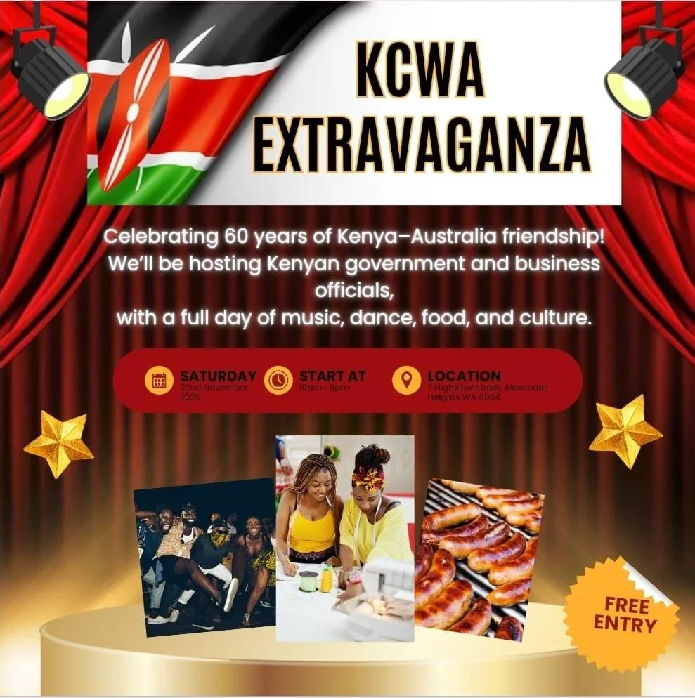 The Kenyan Community in Western Australia (KCWA) is thrilled to invite you to the 2025 KCWA Cultural Extravaganza, a milestone celebration marking 60 years of Kenya–Australia friendship.